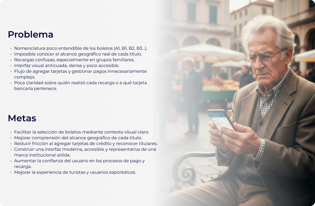 El rediseño propone reemplazar la lista abstracta de boletos por una interfaz organizada en tarjetas visuales donde cada título incluye un modal informativo: descripción clara, ejemplo de uso y un mapa ilustrado que muestra su alcance real.